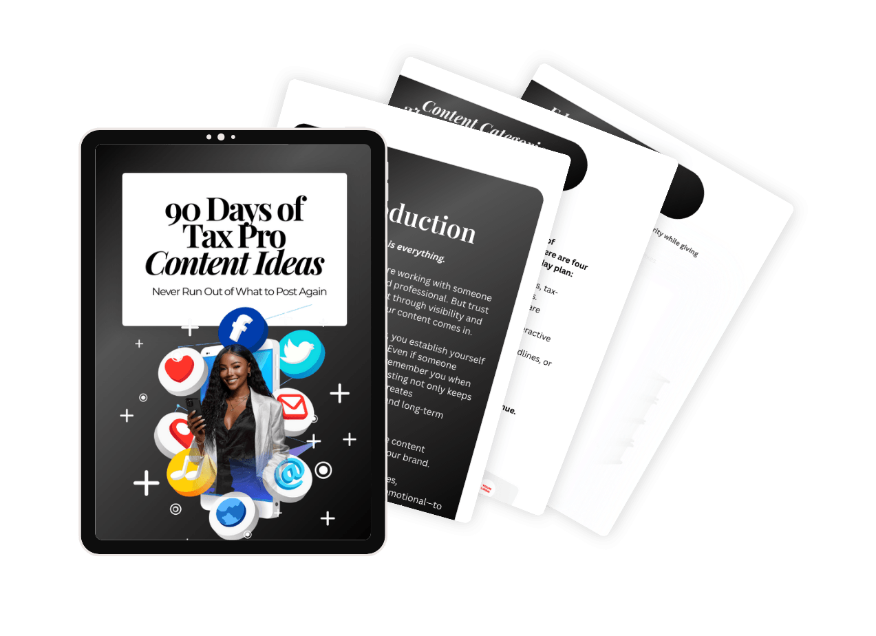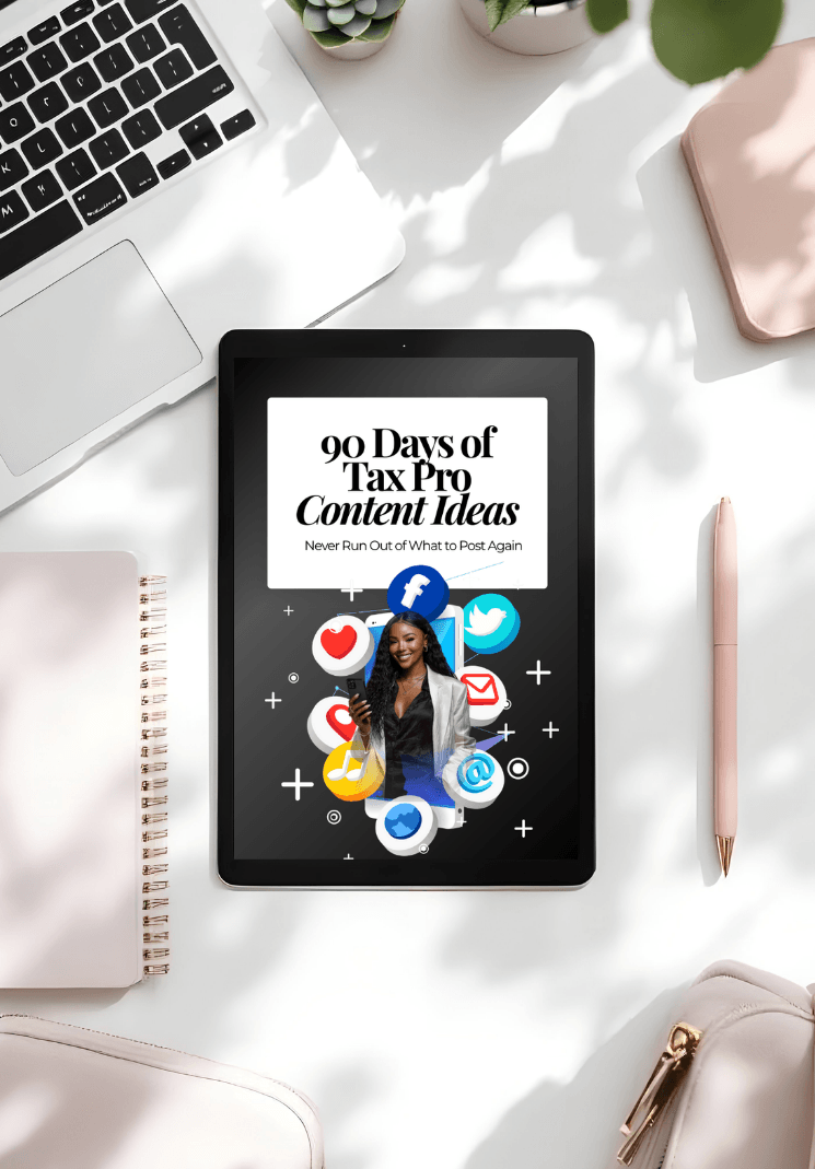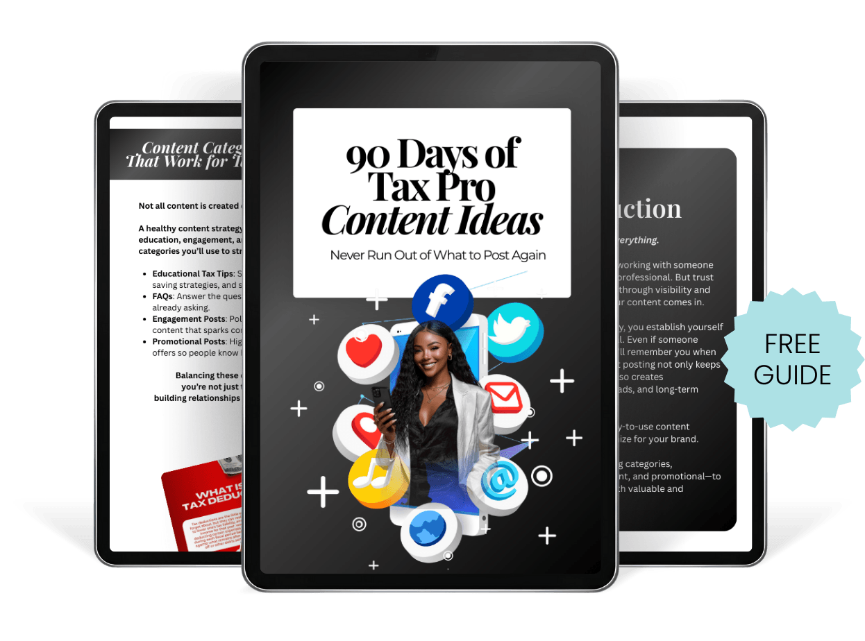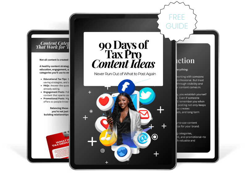 Grab your free 8-page PDF packed with strategic post ideas, client-attracting prompts, and a simple 90-day implementation blueprint. Perfect for tax preparers who want to stay consistent, stay visible, and actually enjoy marketing again